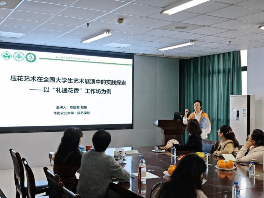 分享会上,陈国菊教授围绕国家级一流课程建设、大学生创新创业大赛指导、压花艺术美育教学实践三大核心主题展开分享。她结合《压花艺术——发现植物之美》国家级一流课程的建设历程,系统拆解了课程设计、申报打磨、智慧课堂构建的全流程经验;以指导学生斩获“挑战杯”、全国大学生艺术展演等赛事奖项的典型案例为依托,详细讲解了从项目选题、作品创作到赛事备赛、现场展演的关键技巧,分享了“课程—工作坊—展演”三位一体的育人模式,阐释了植物科学、美育教育与文创产业深度融合的教学改革思路。
